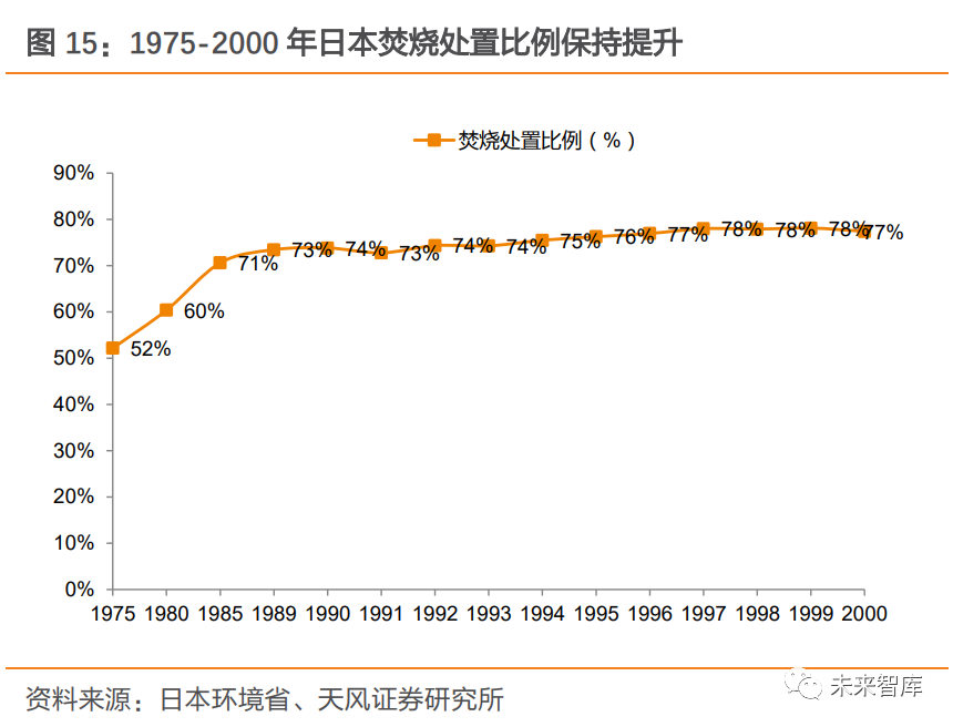 1.3. 補(bǔ)貼退坡已被市場消化,期待垃圾發(fā)電企業(yè)的破局之道補(bǔ)貼退坡影響已被市場消化,板塊估值處于歷史低位。近兩年,市場對垃圾焚燒補(bǔ)貼退坡的擔(dān)憂一直成為壓制板塊估值的重要因素之一,垃圾焚燒企業(yè)表現(xiàn)近年弱于市場。2020 年 9 月 29 日,《關(guān)于<關(guān)于促進(jìn)非水可再生能源發(fā)電健康發(fā)展的若干意見>有關(guān)事項的補(bǔ)充通知》發(fā)布,更是加劇了市場對焚燒發(fā)電企業(yè)的盈利性和成長性的擔(dān)憂,造成短期板塊的明顯下挫。9 月 29 日至今,垃圾焚燒(長江)指數(shù)下降 12.3%;而同期上證綜指上漲 1.8%, 大幅跑輸市場 14.1 個百分點。從估值層面看,截至最新,我們選取的 8 家垃圾焚燒發(fā)電企業(yè),綜合市盈率 19 倍,處歷史低位。我們認(rèn)為垃圾焚燒發(fā)電企業(yè)仍有成長及盈利優(yōu)化空間。我國垃圾焚燒企業(yè)運營收入包括上網(wǎng)電費收入及垃圾處理服務(wù)費收入,占比大致為 7:3。發(fā)電收入中,噸上網(wǎng)電量受入爐垃圾熱值、技術(shù)工藝、廠用電率等因素影響;上網(wǎng)電價受政策調(diào)控,由當(dāng)?shù)孛摿蛉济簷C(jī)組標(biāo) 桿上網(wǎng)電價、省級電網(wǎng)負(fù)擔(dān)和國家可再生能源電價附加基金負(fù)擔(dān)三部分構(gòu)成。垃圾處置費根據(jù)噸垃圾處置單價(競標(biāo)決定)和處理量確定,由項目所在地政府支付。本篇報告將從行業(yè)成長性(與焚燒處理量相關(guān)),以及垃圾發(fā)電企業(yè)盈利性(與企業(yè)財務(wù)狀況、噸上網(wǎng) 電量、噸垃圾處理費單價相關(guān))兩方面出發(fā),解析國補(bǔ)退坡及垃圾分類背景下,為何依舊 看好行業(yè)的發(fā)展前景。2. 成長性方面,國內(nèi)垃圾焚燒市場仍大有可為2.1. 復(fù)盤國外:焚燒處置量趨穩(wěn),分類制度并未產(chǎn)生明顯減量效果2.1.1. 日本:焚燒是垃圾處置主流方式,多年占比超 70%1980s 開始,日本大規(guī)模實施垃圾分類,并未造成焚燒處置量下降。1960s,在經(jīng)濟(jì)高速發(fā)展背景下,日本多個地區(qū)垃圾處置產(chǎn)能與處置需求間存在較大缺口,政府加大焚燒處置推進(jìn)力度,垃圾焚燒產(chǎn)業(yè)得到快速擴(kuò)張。1975 年-2000 年,日本垃圾焚燒處置比例由 52.20% 逐步提升至 77.40%,焚燒比例快速提升。這個過程伴隨著經(jīng)濟(jì)增長帶來的人均垃圾產(chǎn)量的持續(xù)增長,和垃圾分類從 1980s 開始大規(guī)模實施。事實上,1980-2000 年期間,日本垃圾分類造成的資源化比例提升,并未造成焚燒處置量的下降,焚燒量和焚燒處置比例持續(xù)保持正增長。