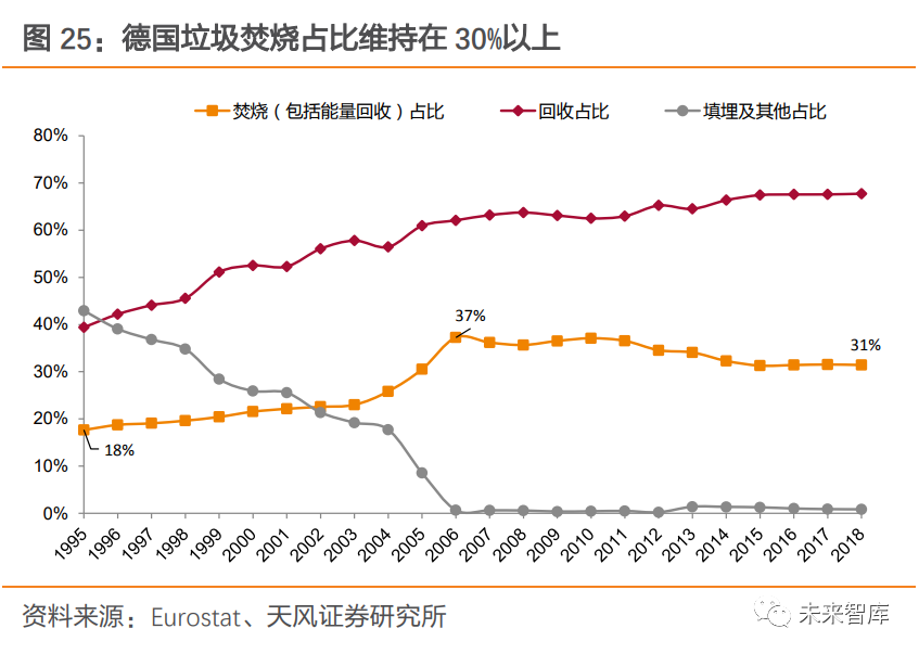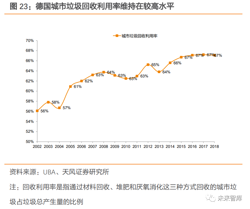 2.1.3. 德國:重視回收循環(huán),“零填埋”政策下焚燒量較穩(wěn)定德國較早開始實施垃圾分類,回收利用率較高。1992 年,德國在全國建立“綠點制”回收系統(tǒng),與各生產(chǎn)企業(yè)合作,將印有綠點標(biāo)記的、具有再生價值的包裝物回收再利用。2011 年,已經(jīng)有 1.6 萬家德國包裝生產(chǎn)和使用企業(yè)加入了綠點系統(tǒng),超過 90%的商品外包裝印上了綠點標(biāo)記。分類制度推行下,德國城市垃圾總產(chǎn)生量控制良好,由 2002 年的 5277 萬噸變動至 2018 年 5030 萬噸,城市垃圾回收利用率也從 2002 年 56%上升至 2018 年 67%。