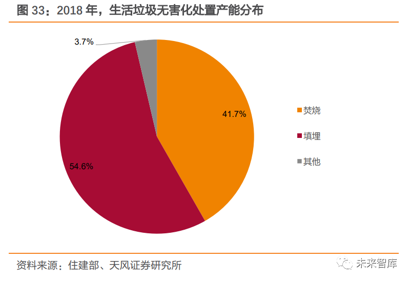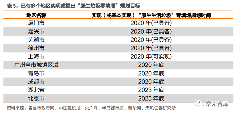 土地資源緊張+選址困難,填埋產(chǎn)能新增難度較大。一方面,我國土地資源較為緊張,城鎮(zhèn)化又進(jìn)一步壓縮了城市公用設(shè)施用地的供給空間,垃圾填埋廠用地受限。另一方面,垃圾填埋場選址難度較大,需考量地質(zhì)、地形、水文、氣候、城市規(guī)劃、交通運輸?shù)雀黝愐蛩?,不符合《生活垃圾衛(wèi)生填埋處理技術(shù)規(guī)范》等相關(guān)規(guī)定中選址要求的填埋場,很可能無法滿足環(huán)評要求,填埋產(chǎn)能新增難度較大。環(huán)保治理力度加大+填埋場超負(fù)荷運行,垃圾填埋存量項目封場提速。非正規(guī)垃圾填埋場由于配套設(shè)施不健全、執(zhí)行標(biāo)準(zhǔn)缺失、不規(guī)范填埋作業(yè)等多種原因,對周邊環(huán)境存在著較為嚴(yán)重的污染隱患。隨著居民環(huán)保訴求提升以及政府層面環(huán)保治理力度加大,不符合環(huán)保要求的填埋場陸續(xù)被關(guān)停。我國在《“十二五”全國城鎮(zhèn)生活垃圾無害化處理設(shè)施建設(shè)規(guī)劃》首次提出存量垃圾治理,預(yù)計實施存量治理項目 1882 個,衛(wèi)生填埋場封場項目有 802 個?!笆逡?guī)劃”預(yù)計實施存量治理項目 803 個。此外,垃圾填埋場超負(fù)荷運轉(zhuǎn)現(xiàn)象突出,庫容趨飽和,加速封場進(jìn)程。由于近些年垃圾產(chǎn)量增速較高,以及部分地區(qū)焚燒設(shè)施尚在規(guī)劃建設(shè)中,垃圾填埋場超負(fù)荷運轉(zhuǎn)現(xiàn)象突出, 庫容加速飽和,需提前封場。以 2020 年 2 月封場的西安市江村溝垃圾填埋場為例,作為曾經(jīng)國內(nèi)以及亞洲最大的垃圾填埋場,其設(shè)計日處理量 2600 噸。但隨著城市發(fā)展以及人口快速增長,垃圾處理量已由建成之初的 800 噸/日上升至 2019 年 10000 噸/日左右,超負(fù)荷運轉(zhuǎn)下提前 20 年迎來飽和。垃圾填埋“新增難+存量減”背景下,垃圾焚燒替代屬性凸顯,產(chǎn)能占比有望進(jìn)一步提升。 垃圾焚燒作為垃圾填埋的最主要替代方式,具有占地面積小、處理效率高、環(huán)境污染小、 能源利用高等多方面優(yōu)勢。2020 年 8 月,國家發(fā)展改革委、住房城鄉(xiāng)建設(shè)部和生態(tài)環(huán)境部 等三部委聯(lián)合印發(fā)《城鎮(zhèn)生活垃圾分類和處理設(shè)施補(bǔ)短板強(qiáng)弱項實施方案》,明確提出“原 則上地級以上城市以及具備焚燒處理能力的縣(市、區(qū)),不再新建原生生活垃圾填埋場, 現(xiàn)有生活垃圾填埋場主要作為垃圾無害化處理的應(yīng)急保障設(shè)施使用。”截至目前,已有多個省市提出“原生生活垃圾零填埋”的規(guī)劃目標(biāo),垃圾焚燒替代屬性凸顯。