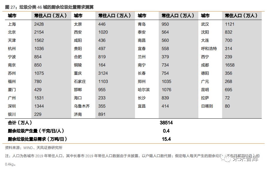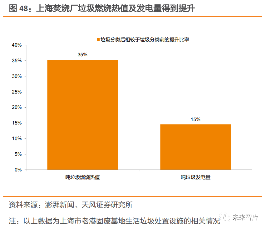 2.2. 展望國內(nèi):垃圾產(chǎn)量及焚燒占比仍處上升通道,焚燒需求將保持旺盛2.2.1. 垃圾分類減量化效果短期較難兌現(xiàn),廚余產(chǎn)能落地是關(guān)鍵影響因素從實際情況看,垃圾分類減量程度受廚余產(chǎn)能規(guī)模影響。由于有害垃圾占比很小,可回收垃圾在過去資源化利用率也較高,濕垃圾分出量對無害化處置總量影響較大。但在廚余處置產(chǎn)能不足情況下,從分揀前端分離出的濕垃圾,仍需通過焚燒等無害化處置方式進(jìn)行最終解決,會削弱減量化效果。廚余產(chǎn)能缺口較大,許多城市推進(jìn)垃圾分類工作時,仍面臨缺乏專業(yè)大型廚余垃圾處置設(shè)施這一難題。以濕垃圾末端處理設(shè)施建設(shè)進(jìn)度較快的上海為例,截至 2020 年 6 月中旬, 濕垃圾分出量達(dá) 9632.13 噸/日,大于目前濕垃圾處置能力 5050 噸/日。據(jù)我們預(yù)測, 46 個垃圾分類重點城市,每日廚余垃圾(不含餐廚垃圾)處置需求達(dá) 15.4 萬噸。而據(jù) E20 公布,2019 年 5 月底,大規(guī)模廚余垃圾處理廠每日總處理能力合計僅為 0.6 萬噸。