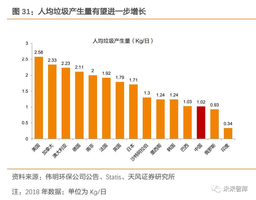 初始投資大+建設(shè)周期長,補(bǔ)齊廚余產(chǎn)能缺口仍需時間,短期來看垃圾分類“量減”影響有限。據(jù) E20 統(tǒng)計,2020 年上半年,餐廚/廚余處理處置項目共計成交 39 個,成交數(shù)量僅次于垃圾焚燒板塊,占固廢市場總成交項目個數(shù)比例超 35%。目前各地正加快推進(jìn)廚余設(shè)施建設(shè),但廚余處置項目前期投資較大,且從規(guī)劃、建設(shè)到實際投運的周期也較長,補(bǔ)齊 產(chǎn)能缺口仍需時間。在現(xiàn)階段廚余產(chǎn)能與垃圾分類制度推行不匹配情況下,預(yù)計垃圾分類帶來的“量減”影響有限。2.2.2. 總量增+焚燒占比提升,需求仍將保持旺盛隨著城鎮(zhèn)化穩(wěn)步推進(jìn),我國人均垃圾產(chǎn)量及垃圾總產(chǎn)生量有望繼續(xù)增長。根據(jù)世界銀行的數(shù)據(jù),城鎮(zhèn)化率提升和人均垃圾產(chǎn)生量有一定正相關(guān)性。近年來,我國城鎮(zhèn)化進(jìn)程加速推進(jìn),2019 年底城鎮(zhèn)化率已達(dá) 61%,但仍低于國外發(fā)達(dá)國家(如美國、日本 2018 年城鎮(zhèn)化 率分別為 82.3%、91.6%)。且我國人均垃圾產(chǎn)生量也較低,據(jù) Statista 數(shù)據(jù)顯示,2018 年我國人均垃圾產(chǎn)生量 1.02Kg/日,而同期的美國、加拿大、澳大利亞等地區(qū)的人均垃圾產(chǎn)生量均超過 2kg/日。展望未來,隨著城鎮(zhèn)化進(jìn)一步推進(jìn),人均垃圾產(chǎn)生量有望進(jìn)一步提升,疊加人口增速共同帶動生活垃圾產(chǎn)生量繼續(xù)增長,對垃圾處置需求構(gòu)成有力支撐。