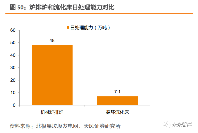 3.2.2. 噸發(fā)電量提升原因二:技術(shù)工藝優(yōu)化爐排爐已成為成熟的技術(shù)路線。垃圾焚燒技術(shù)主要包括流化床焚燒和爐排爐焚燒。在行業(yè)發(fā)展初期,由于國外引進(jìn)的爐排爐焚燒技術(shù)存在不適應(yīng)性以及成本高昂等問題,國內(nèi)自主研發(fā)的流化床焚燒技術(shù)應(yīng)用較多。隨著國產(chǎn)化爐排爐技術(shù)發(fā)展,以及流化床技術(shù)“多飛灰” 不足的凸顯,爐排爐技術(shù)逐漸取代流化床技術(shù),得到快速發(fā)展。從現(xiàn)有爐型分布上看,2020 年,全國已運行垃圾焚燒廠 492 座,涉及 1202 臺焚燒爐,其中,機(jī)械爐排爐臺數(shù)占比超過 86%,循環(huán)流化床臺數(shù)占比不到 14%;從處置量來看,全國機(jī)械爐排爐日合計處理能力超過 48 萬噸,循環(huán)流化床日合計處理能力僅為 7 萬 1 千噸左 右。