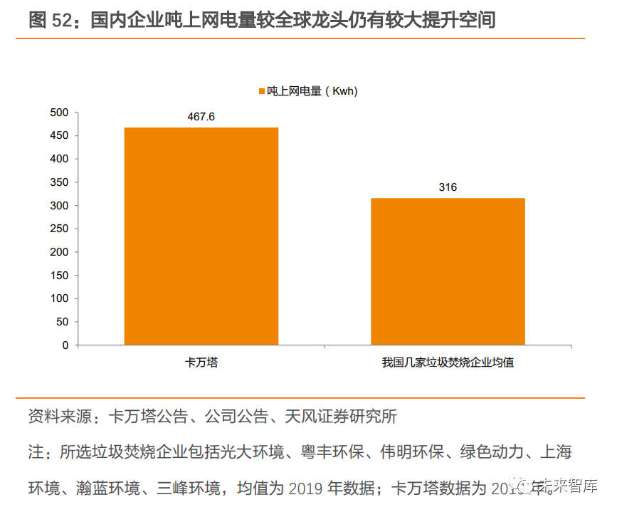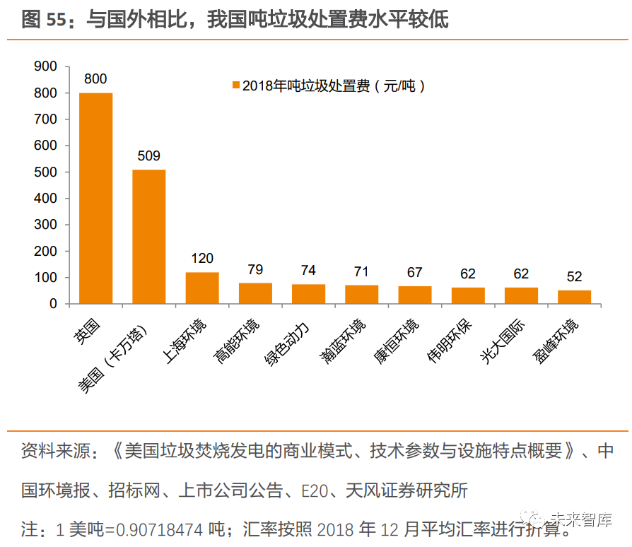 相較于流化床技術(shù),爐排爐技術(shù)因垃圾瀝水量較多、鍋爐效率較高等原因,具有更高的噸上網(wǎng)量,從而帶動垃圾焚燒發(fā)電企業(yè)盈利能力提升。中溫次高壓技術(shù)逐步得到推廣。在過去,受限于生活垃圾的復(fù)雜性以及焚燒發(fā)電技術(shù)處理水平有限,國內(nèi)垃圾焚燒電廠基本采用中溫中壓蒸汽參數(shù)來防止過熱器等受熱面管高溫腐蝕。但據(jù)《生活垃圾焚燒廠噸垃圾發(fā)電量的研究分析》研究表明,垃圾熱值相近的情況下, 使用中溫次高壓參數(shù)時發(fā)電量更高。隨著我國垃圾分類的推進(jìn)及焚燒發(fā)電技術(shù)日益成熟, 部分焚燒廠率先使用中溫次高壓技術(shù)來提高發(fā)電效率。例如在 2009 年,深能源投資的武漢市江北西部垃圾焚燒廠、福建創(chuàng)冠投資的湖北黃石垃圾焚燒發(fā)電廠、在建的北京廊坊垃圾焚燒發(fā)電項目等先后采用中溫次高壓技術(shù),在國內(nèi)掀起應(yīng)用熱潮,中溫次高壓技術(shù)也逐步得到推廣,進(jìn)一步提升噸發(fā)電量。3.2.3. 噸發(fā)電量較國外仍有較大提升空間我國噸發(fā)電量較發(fā)達(dá)國家仍有差距,未來提升空間較大。深圳市生活垃圾處理監(jiān)管中心發(fā)布的文章顯示,美國生活垃圾熱值可達(dá)到我國目前平均水平的兩倍,美國生活垃圾焚燒噸發(fā)電量也在 600kWh 以上,表明我國生活垃圾熱值及噸發(fā)電量仍有較大提升空間。展望未來,垃圾分類制度仍在持續(xù)推進(jìn),焚燒企業(yè)的處理工藝仍在不斷優(yōu)化,噸發(fā)電量提升未來可期,垃圾焚燒企業(yè)盈利能力有望得到持續(xù)優(yōu)化。