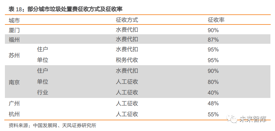 噸發(fā)電量提升30-54 度/噸(提升 10-18%),可對沖政策負(fù)向影響。對一個日處置量 1000 噸的垃圾焚燒項目進(jìn)行測算,假設(shè)在項目補(bǔ)貼結(jié)束后,標(biāo)桿上網(wǎng)電價按 0.45 元/度確認(rèn);在技術(shù)提升所帶來的不同上網(wǎng)電量情景假定下,我們發(fā)現(xiàn),假定其他條件不變,補(bǔ)貼 15 年后退坡,若項目噸發(fā)電量較測算基準(zhǔn)(300 度/噸)提升 30 度/噸(提升 10%),將能維持項目的 IRR 不變(8.8%)。補(bǔ)貼 10 年后退坡,若項目噸發(fā)電量較測算基準(zhǔn)提升 54 度/ 噸(提升 18%),項目的 IRR 也能保持不變。3.3. 收費制度逐步完善,垃圾處置費有望上調(diào)3.3.1. 國內(nèi)以定額征收為主,財政補(bǔ)貼缺口較大垃圾處置收費制度主要包括定額征收及計量征收。定額征收主要指以家庭住戶或者個人作為收費單位,不論垃圾排放量的多少,一律按照當(dāng)?shù)卣_定的繳費標(biāo)準(zhǔn)進(jìn)行繳費,收費標(biāo)準(zhǔn)較低。計量征收包括按指定垃圾桶數(shù)征收、按垃圾重量征收和按垃圾袋數(shù)量征收等, 與垃圾產(chǎn)生量直接掛鉤。1991 年,我國開始提出對城市垃圾處置實行服務(wù)性收費制度,并于 2018 年首次提出 “按量收費”經(jīng)濟(jì)政策。以 2002 年 6 月國家發(fā)改委等部委聯(lián)合頒布《關(guān)于實行城市生活垃圾處理收費制度促進(jìn)垃圾處理產(chǎn)業(yè)化的通知》 為時間節(jié)點, 我國正式開征城市生活垃圾處置費。自 2011 年起, 一些城市政府高度重視垃圾分類, “按量收費”政策在北京與廣州兩個 城市先后醞釀并試點。2018 年 6 月,國家發(fā)改委發(fā)布《關(guān)于創(chuàng)新和完善促進(jìn)綠色發(fā)展價格機(jī)制的意見》,提出 2020 年底前,全國城市及建制鎮(zhèn)全面建立生活垃圾處理收費制度, 同時首次明確提出 “按量收費”的經(jīng)濟(jì)政策,嘗試以經(jīng)濟(jì)激勵改變行為人的垃圾處置行 為。居民端收費以定額為主,非居民端實現(xiàn)計量征收。①收費標(biāo)準(zhǔn):據(jù)國家發(fā)改委的數(shù)據(jù),除沈陽、寧波和上海外,33 個城市制定了居民生活垃圾處置費收費標(biāo)準(zhǔn),其中,長沙、海口 和烏魯木齊為水消費系數(shù)法隨水計征,深圳為按排污水量計征,其他 28 個城市為按戶或按人計征。除沈陽外,35 個城市制定了非居民生活垃圾處理收費標(biāo)準(zhǔn)。②收費方式:主要 是上門收取和委托代收,采取委托代收的,一般為委托居委會、物業(yè)公司代收,委托稅務(wù)、 工商、財政等部門代收代繳,或與水費、燃?xì)赓M等公用事業(yè)費用聯(lián)合收取等。