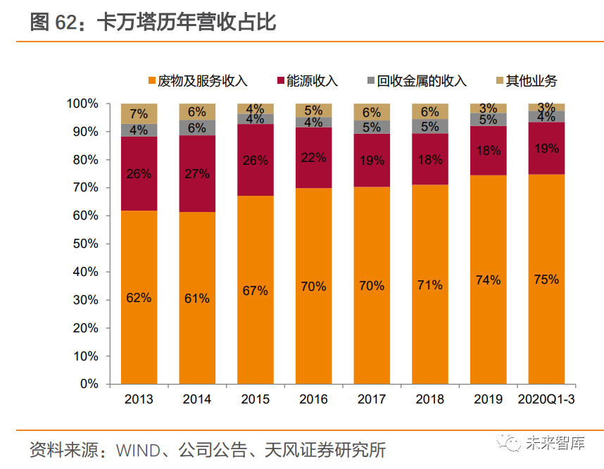 垃圾處置費由“污染”主體承擔(dān),市場化程度較高。美國垃圾處置費按照“誰污染、誰付費”的原則,由當(dāng)?shù)卣蚴者\企業(yè)向居民(企業(yè))收取,再支付給焚燒廠業(yè)主或運營商, 每噸垃圾處置費在 50-70 美元之間居多。市場化機(jī)制下,垃圾處置費成為垃圾焚燒廠收入 的最主要來源。美國焚燒企業(yè)垃圾處置費占總運營收入的比例平均值約 70%,以卡萬塔為例,垃圾處置費收入占比常年高于 60%,2020Q1-3 垃圾處置費收入占比達(dá) 75%。