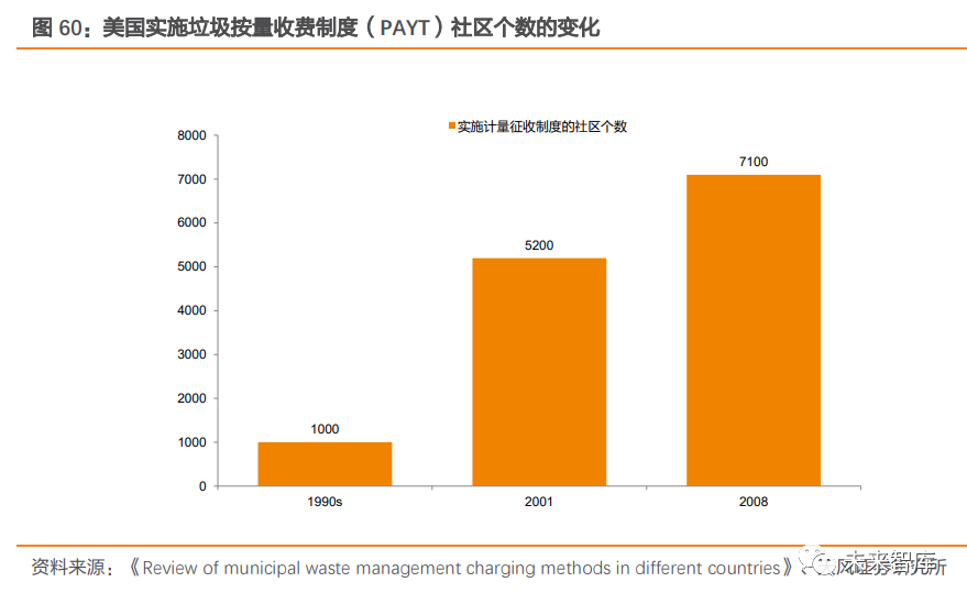 日本多采用單一計量收費制。在日本,常見的垃圾收費類型有單一計量收費制、累進(jìn)計量收費制、定量免費制、補(bǔ)助組合收費制和定額收費制 5 種。據(jù)山谷修作的調(diào)查統(tǒng)計,截至2015 年 4 月,日本全國 457 個實行垃圾收費的城市中,有 430 個城市采用單一計量收費制,所占比率為 94%。在采用單一計量收費制的城市中,單個垃圾袋價格(通常為 40~50L 的大袋)以 30-50 日元(1.92-3.20 人民幣)居多。日本垃圾處理廠建設(shè)資金及運營費用由財政承擔(dān),財政支出負(fù)擔(dān)加大對垃圾有償收費制度的實施有推動作用。隨著日本垃圾處置費用隨處置量與日俱增,財政支出負(fù)擔(dān)加大。例如 北九州市的日明凈工廠,在該地區(qū)未實施垃圾收費制度時,2008 年運營收入不及費用支出的一半,剩余的運營費用缺口部分需要依靠財政補(bǔ)貼。據(jù)《日本垃圾處理:政策演進(jìn)、影響因素與成功經(jīng)驗》文中介紹,為了緩解財政支出壓力,日本實施生活垃圾有償收費制度的市町村有所上升,以滿足垃圾處置資金需求,體現(xiàn)出財政支出壓力對垃圾收費制度的推 動作用。(2)美國:以計量收費制為主,垃圾處置費由“污染”主體承擔(dān)美國較早推行計量收費制。1980s 起,計量收費制在美國多個地區(qū)興起。到 2008 年,美國已有 7100 個社區(qū),通過計量收費的方式向 7500 萬人征收垃圾處置費,約占總?cè)丝诘?25%。其采取的計量方式大多是隨垃圾桶或者垃圾袋、垃圾標(biāo)簽征收。以馬薩諸塞州的阿特爾伯勒為例,該地于 2005 年起實施計量收費制度,居民每月需繳納 15 美元,每周可處理 36 加侖以內(nèi)的垃圾,超過則需另外購買購物袋(7.2 加侖的購物袋需支付 1.5 美元)。