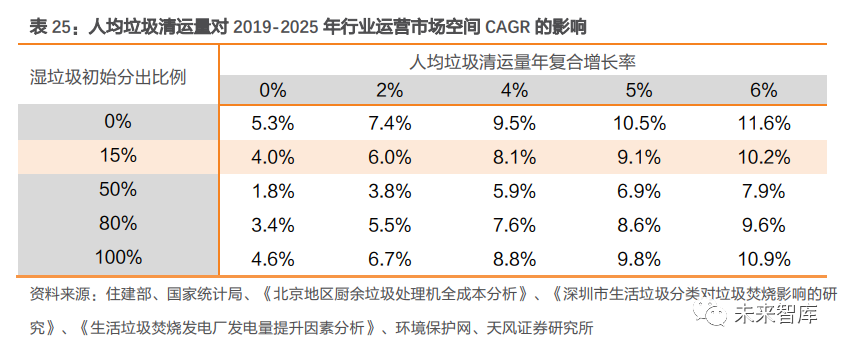 3.3.3. 我國垃圾收費政策細(xì)則有望逐步完善,處置費有望上調(diào)從國外實踐看,計量收費制度下征收水平較高,能為垃圾焚燒廠處置費收入提供更為充足的資金保障,但是否實施計量收費制仍需衡量多方利益。一方面,制定計量收費制度需要 更多政策的制定和執(zhí)行成本;另一方面,實施計量制度還需要用于計量的運輸設(shè)備、健全的垃圾回收機(jī)制等。據(jù)《關(guān)于城市生活垃圾不同收費制度的思考》文中分析,我國大部分城市未采用計量收費制度的原因,除了更多的交易費用外,還包括居民責(zé)任意識不強(qiáng)、回收機(jī)制不完全等,且這一制度有可能導(dǎo)致非法傾倒、私自焚燒垃圾等現(xiàn)象。國內(nèi)政策環(huán)境逐步成熟,征收方式有望向計量轉(zhuǎn)變,垃圾處置費或?qū)⑸险{(diào)。從全球?qū)嵺`看, 人均 GDP 水平較高、回收體系較健全的發(fā)達(dá)國家更多采用計量收費政策。我國人均 GDP 水平正在穩(wěn)步上升,加之垃圾分類、回收體系的不斷健全以及居民環(huán)境意識的逐步增強(qiáng), 垃圾收費制度有望向計量征收轉(zhuǎn)變。此外,隨著人工費用、燃油和材料等價格上漲,定價部門預(yù)計將按實際情況細(xì)化收費項目,調(diào)整收費項目和費率,垃圾焚燒企業(yè)垃圾處置費也有望上調(diào)。垃圾處置單價上調(diào) 22%-39%可對沖政策負(fù)向影響。國補(bǔ)退坡政策施行后,若想維持項目盈利能力不變,垃圾焚燒企業(yè)可與地方政府協(xié)調(diào),爭取上調(diào)垃圾處置費,從而確保項目的盈利能力和收入水平。據(jù)我們測算,在補(bǔ)貼 15 年后退坡的假設(shè)下,為維持項目 IRR 不變,政府的垃圾處理單價應(yīng)該從 60 元/噸上調(diào)至 73 元/噸,上調(diào)幅度 22%;10 年后退坡,則應(yīng)上調(diào)至 83 元/噸,上調(diào)幅度 39%。4. 綜合成長及盈利性因素,垃圾焚燒運營收入仍有增長空間垃圾分類會帶來“量減”和“熱值提升”雙向影響。垃圾分類一方面會通過提高資源化處置量,影響焚燒處置量;另一方面也通過降低生活垃圾中濕垃圾占比,帶動入爐垃圾熱值提升,使得噸發(fā)電量同步提升。綜合考慮垃圾分類帶來的“量減”+“熱值升”,以及城鎮(zhèn)化率提升、技術(shù)工藝優(yōu)化等影響因素,據(jù)我們測算,2019-2025 年垃圾焚燒行業(yè)運營收入 GAGR 約 7%,垃圾分類減量化影響下仍有增長空間。①生活垃圾各成分占比:假定濕垃圾、可回收垃圾及干垃圾占比分別為 55%、10%、35%。由于有害垃圾占比很小,暫不考慮有害垃圾的影響。②分出比例:假定濕垃圾與可回收垃圾的分出比例相同,2019 年設(shè)定為 15%,隨著分類體 系的健全,逐年提升 10%。③濕垃圾回收處置率:假定 2019 年濕垃圾回收處置率 40%,并隨著廚余處置產(chǎn)能擴(kuò)增,逐年提升 10%。④殘渣占比:由于濕垃圾資源化處置后的廢渣仍需通過焚燒進(jìn)行最終處置,假定殘渣占比 20%。⑤由垃圾分類導(dǎo)致的噸發(fā)提升量:據(jù)《深圳市生活垃圾分類對垃圾焚燒影響的研究》相關(guān)內(nèi)容,我們推算出當(dāng)濕垃圾在入爐垃圾中的占比降低 1% 時,噸垃圾發(fā)電量可以提升 2.2-3.0Kwh,保守假定濕垃圾占比下降 1%會帶來噸發(fā)電量提升 2.2Kwh。⑥由技術(shù)工藝優(yōu)化導(dǎo)致的噸發(fā)提升量:據(jù)《生活垃圾焚燒發(fā)電廠發(fā)電量提升因素分析》介紹,李坑一廠借助中溫超高壓技術(shù),噸垃圾發(fā)電量達(dá) 350~360kWh,以及在垃圾熱值相近 的情況下,中溫次高壓余熱鍋爐發(fā)電量增加 17%。我們假定技術(shù)優(yōu)化帶來噸發(fā)電量提升50Kwh,由2019年300Kwh線性提升至2025年350Kwh。⑦噸垃圾處置費及年復(fù)合增長率:假定 2019 年噸垃圾處置費單價 70 元,未來每年按 CPI 增速 3%增長。城鎮(zhèn)化率提升+人均垃圾清運量提升+技術(shù)優(yōu)化三道屏障,可對沖垃圾分類減量影響,運營總收入市場空間有望保持增長。若從靜態(tài)時點單獨分析垃圾分類對焚燒量的影響,在 2019 年數(shù)據(jù)及相關(guān)假設(shè)的基礎(chǔ)上,相較于垃圾分類前,隨著濕垃圾分出比例提升,焚燒處置量下滑程度加大。但從長期動態(tài)視角看,在城鎮(zhèn)化率、人均垃圾清運量、焚燒占比共同提升趨勢下,焚燒需求仍將保持旺盛,疊加垃圾分類及技術(shù)進(jìn)步驅(qū)動下的噸上網(wǎng)電量提升,垃圾焚燒廠運營收入市場空間有望保持正增長。