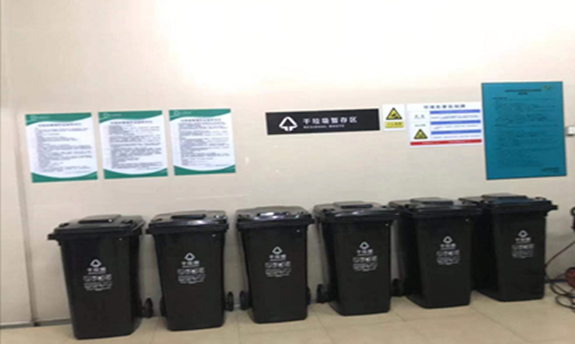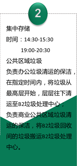 樓層公共區(qū)域的保潔工作人員負(fù)責(zé)垃圾初步分類,分類垃圾桶內(nèi)的垃圾袋按顏色區(qū)分,在垃圾分好類并用袋裝密封后,將由專人從上至下層層收集并運輸,減少貨梯使用時間,提高垃圾運輸效率。