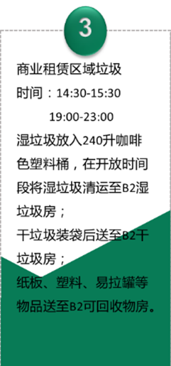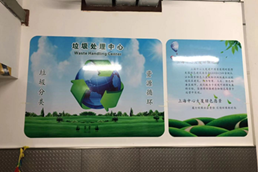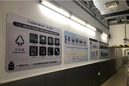 上海中心大廈對B2垃圾房(地下2層)進行改造,改造后的垃圾房針對不同垃圾進行分區(qū)管理,并添加了垃圾分類相關(guān)的宣傳海報及公示欄。結(jié)合BOMA(中國)標(biāo)準(zhǔn)將管理文件、警示標(biāo)志,以及清潔消毒藥劑MSDS張貼上墻,引導(dǎo)白領(lǐng)、租戶正確投放垃圾。