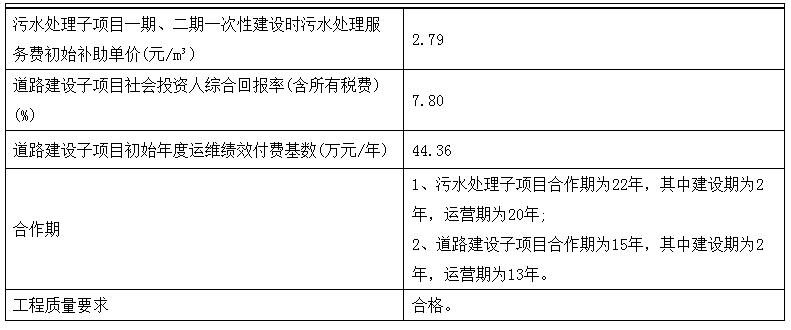 污水處理子項(xiàng)目合作期為22年,其中建設(shè)期為2年,運(yùn)營(yíng)期為20年;道路建設(shè)子項(xiàng)目合作期為15年,其中建設(shè)期為2年,運(yùn)營(yíng)期為13年。