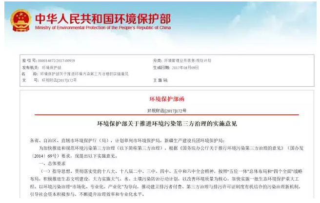 環(huán)境保護部關于推進環(huán)境污染第三方治理的實施意見