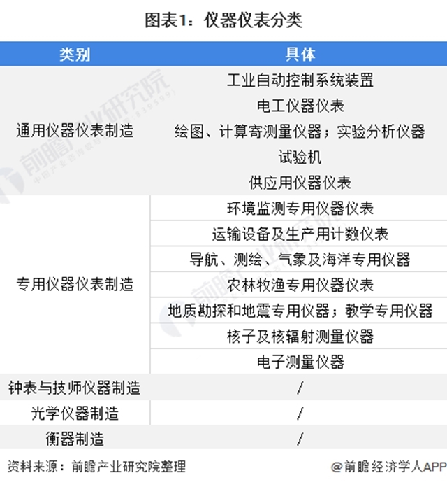 儀器儀表應(yīng)用領(lǐng)域廣泛,覆蓋了工業(yè)、農(nóng)業(yè)、交通、科技、環(huán)保、國防、文教衛(wèi)生、人民生活等各方面,在國民經(jīng)濟(jì)建設(shè)各行各業(yè)的運(yùn)行過程中承擔(dān)著把關(guān)者和指導(dǎo)者的任務(wù)。根據(jù)《國民經(jīng)濟(jì)行業(yè)分類》(GB/T4754-2017),儀器儀表制造行業(yè)可以分為通用儀表儀器制造、專用儀器儀表制造、鐘表與計時儀器制造、光學(xué)儀器制造和衡器制造。