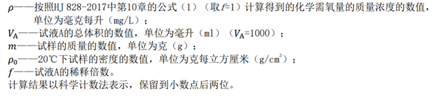 試樣中化學需氧量(CODCr)以質量濃度ρ1計,單位以毫克每升(mg/L)表示,按式(1)計算: