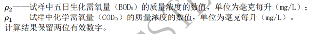 試樣中五日生化需氧量(BOD5)以質量濃度ρ2計,單位以毫克每升(mg/L)表示,按式(2)計算: