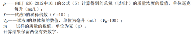 稱取10 g試樣,精確至0.01 g,加水轉移至100 mL容量瓶中,用水稀釋至刻度,搖勻。此為試液D。移取10 mL試液D至100 mL容量瓶中,加上稀釋至刻度,搖勻。必要時,采用逐級稀釋法,用水稀釋至刻度,搖勻,使待測溶液中總氮含量范圍在0.20 mg/L——7.00 mg/L。
