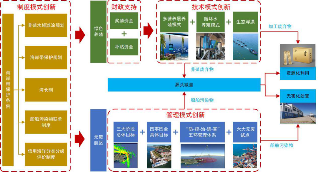 近年來,威海市立足“海洋強市”戰(zhàn)略,積極謀劃海洋綠色發(fā)展大局,不斷強化海陸、區(qū)域、政策三個統(tǒng)籌,著力解決養(yǎng)殖加工廢棄物和船舶污染物污染防治問題,探索形成了“海洋廢棄物”陸海統(tǒng)籌綜合管控模式。圖 3 威海市“海洋廢棄物”陸海統(tǒng)籌綜合管控模式示意圖