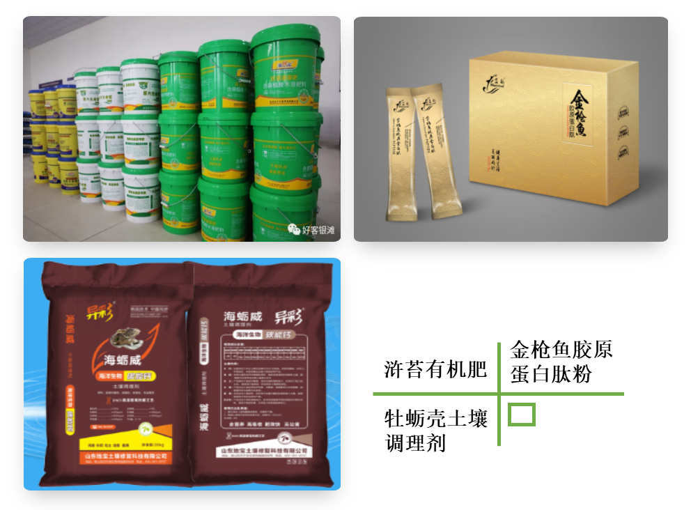 針對滸苔污染,支持溫喜生物科技有限公司,通過研發(fā)生物發(fā)酵技術(shù),構(gòu)建滸苔綜合利用產(chǎn)業(yè)鏈,生產(chǎn)有機(jī)肥、土壤調(diào)理劑,可年處理鮮滸苔10余萬噸,實現(xiàn)產(chǎn)值3500余萬元。針對廢棄牡蠣殼,依托山東地寶土壤修復(fù)科技有限公司,利用高溫增氧活化等技術(shù),可日生產(chǎn)300噸功能性土壤調(diào)理劑,年銷售產(chǎn)品5萬余噸。針對金槍魚加工后剩余的魚骨、魚皮等,推動藍(lán)潤集團(tuán)研發(fā)酶組合技術(shù),開發(fā)生產(chǎn)金槍魚膠原蛋白肽粉、口服液、面膜等系列產(chǎn)品,附加值翻了數(shù)十倍,真正實現(xiàn)將一條金槍魚“吃干榨凈”。圖 14 威海市“海洋廢棄物”資源化利用產(chǎn)品2. 制度模式創(chuàng)新