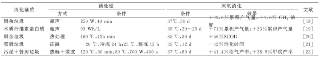 物理預(yù)處理方法包含超聲波、熱處理、凍融和微波處理等手段,相關(guān)研究見表1。超聲波的空化作用和水分子凍結(jié)的冰晶產(chǎn)生的機械作用使細胞壁破解,破壞細胞膜結(jié)構(gòu),使細胞內(nèi)有機物質(zhì)更多溶出,與水解酶充分接觸,增大水解效率,縮短消化時間。微波預(yù)處理與熱處理機理相似,利用電磁場的熱效應(yīng)加熱破壞細胞有機質(zhì)結(jié)構(gòu),但與傳統(tǒng)的熱處理方法相比,微波預(yù)處理加熱速度快、熱效率高、設(shè)備體積小??紤]處理效果的同時,預(yù)處理成本與額外獲取的能源也是應(yīng)該重視的問題。額外獲得能源和預(yù)處理投入相抵后,凍融預(yù)處理因無須添加化學藥品與低能量輸入,是具最高利潤(10~15歐元/(t·kW))的預(yù)處理方法。近年來,水熱預(yù)處理逐漸成為研究熱點,具有更大的發(fā)展前景。水熱預(yù)處理不僅受溫度和停留時間的影響,還與壓力有關(guān)。由于水蒸氣容易獲得,很多工業(yè)生產(chǎn)過程都可能產(chǎn)生大量的水蒸氣且無法合理利用,所以水熱預(yù)處理的成本更低,并且能實現(xiàn)能量的循環(huán)。此外,荷蘭Sustec公司研發(fā)出的TurboTec熱水解工藝為連續(xù)流熱水解工藝,可將污泥熱水解后通過熱轉(zhuǎn)換器回收熱能,使熱水解預(yù)處理的熱能回收利用成為可能。現(xiàn)有能源的利用和能量回收系統(tǒng)的研究,是實現(xiàn)處理效果與經(jīng)濟效益共贏的重要發(fā)展方向。表1 廚余垃圾物理預(yù)處理厭氧消化的相關(guān)研究
