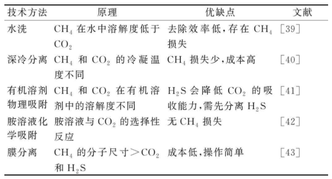 廚余垃圾厭氧消化的產(chǎn)物沼氣成分復(fù)雜,包括CH4、CO2、N2、H2S和硅氧烷等。其中:1)CO2含量越高,沼氣中的熱值越低;2)除甲烷外,沼氣中其他氣體是沼氣污染物。H2S和NH3具有極強的腐蝕性,燃燒后產(chǎn)生的SO2會破壞熱電聯(lián)產(chǎn)裝置和金屬部件。而硅氧烷,即使?jié)舛群苄。紵螽a(chǎn)生的硅膠類氧化物能殘留沉積在燃燒設(shè)備的引擎和閥門上造成故障。這些原因都會導致厭氧消化產(chǎn)生的沼氣不能直接利用,因此需要通過物理化學技術(shù)、生物技術(shù)等對產(chǎn)生的沼氣進行凈化和升級,以提高熱值,將其轉(zhuǎn)化為更高標準的燃料能源。常規(guī)的沼氣凈化升級方法總結(jié)見表2。