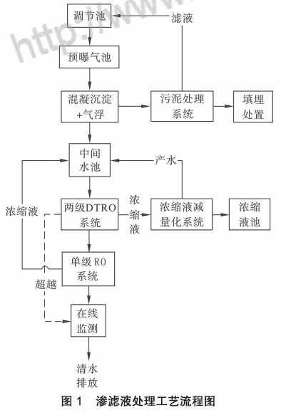 中間水池內(nèi)滲濾液由泵提升進(jìn)入兩級(jí)DTRO系統(tǒng)處理,兩級(jí)DTRO系統(tǒng)前設(shè)置了一套50um的 砂濾系統(tǒng)和一套10um的芯濾系統(tǒng),經(jīng)過兩級(jí)DTRO處理之后,產(chǎn)水經(jīng)過在線監(jiān)測(cè)系統(tǒng)達(dá)標(biāo)排放,兩級(jí)DTRO濃縮液進(jìn)入濃縮液減量化系統(tǒng)做減量處理, 濃縮液減量化系統(tǒng)的產(chǎn)水進(jìn)入中間水池,再次進(jìn)入兩級(jí)DTRO系統(tǒng)處理,濃縮液減量化系統(tǒng)的濃縮液排放到濃縮液池暫存。