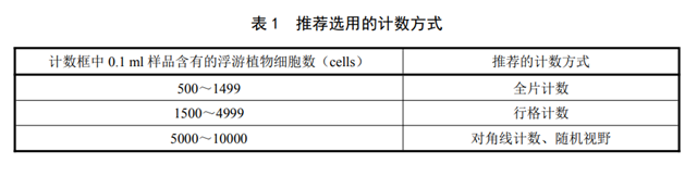 根據(jù) 8.3.1 調(diào)整后的浮游植物的密度,選用合適的計(jì)數(shù)方式,使測(cè)定過程中浮游植物細(xì)胞的總計(jì)數(shù)量為 500 個(gè)——1500 個(gè)。表1為推薦選用的計(jì)數(shù)方式。
