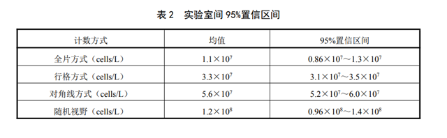 6家實(shí)驗(yàn)室分別用全片計(jì)數(shù)、行格計(jì)數(shù)、對(duì)角線計(jì)數(shù)和隨機(jī)視野計(jì)數(shù)對(duì)浮游植物密度為1×107 cells/L、3×107 cells/L、5×107 cells/L、1×108 cells/L 的實(shí)際樣品進(jìn)行了7次重復(fù)測(cè)定,實(shí)驗(yàn)室內(nèi)的相對(duì)標(biāo)準(zhǔn)偏差分別為2.4%——11%,2.9%——10%,2.7%——11%,4.8%——8.2%;實(shí)驗(yàn)室間相對(duì)標(biāo)準(zhǔn)偏差分別為22%、5.6%、7.1%、21%。計(jì)算測(cè)定結(jié)果對(duì)數(shù)值的 95%置信區(qū)間,再取反對(duì)數(shù)得到的實(shí)驗(yàn)室間95%置信區(qū)間見表2。