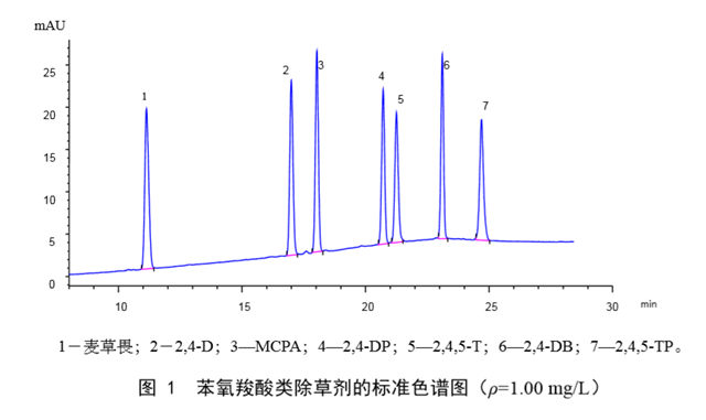 在本標(biāo)準(zhǔn)規(guī)定的儀器參考條件(8.1)下,苯氧羧酸類除草劑的標(biāo)準(zhǔn)色譜圖見圖 1。