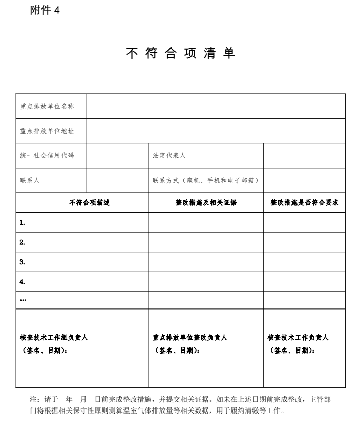 技術(shù)工作組應(yīng)在收到《現(xiàn)場(chǎng)核查清單》后2個(gè)工作日內(nèi),對(duì)《現(xiàn)場(chǎng)核查清單》中未取得有效證據(jù)、不符合核算指南要求以及未按數(shù)據(jù)質(zhì)量控制計(jì)劃執(zhí)行等情況,在《不符合項(xiàng)清單》(見附件4)中“不符合項(xiàng)描述”一欄如實(shí)記錄,并要求重點(diǎn)排放單位采取整改措施。重點(diǎn)排放單位應(yīng)在收到《不符合項(xiàng)清單》后的5個(gè)工作日內(nèi),填寫完成《不符合項(xiàng)清單》中“整改措施及相關(guān)證據(jù)”一欄,連同相關(guān)證據(jù)材料一并提交技術(shù)工作組。技術(shù)工作組應(yīng)對(duì)不符合項(xiàng)的整改進(jìn)行書面驗(yàn)證,必要時(shí)可采取現(xiàn)場(chǎng)驗(yàn)證的方式。