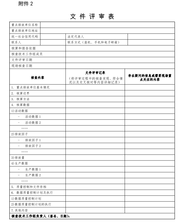 技術(shù)工作組應(yīng)根據(jù)相應(yīng)行業(yè)的溫室氣體排放核算方法與報(bào)告指南(以下簡(jiǎn)稱核算指南)、相關(guān)技術(shù)規(guī)范,對(duì)重點(diǎn)排放單位提交的排放報(bào)告及數(shù)據(jù)質(zhì)量控制計(jì)劃等支撐材料進(jìn)行文件評(píng)審,初步確認(rèn)重點(diǎn)排放單位的溫室氣體排放量和相關(guān)信息的符合情況,識(shí)別現(xiàn)場(chǎng)核查重點(diǎn),提出現(xiàn)場(chǎng)核查時(shí)間、需訪問的人員、需觀察的設(shè)施、設(shè)備或操作以及需查閱的支撐文件等現(xiàn)場(chǎng)核查要求,并按附件2和附件3的格式分別填寫完成《文件評(píng)審表》和《現(xiàn)場(chǎng)核查清單》提交省級(jí)生態(tài)環(huán)境主管部門。