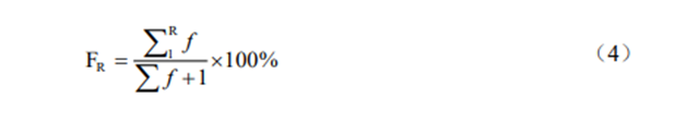 將 lgSMAV 和 lgSMCV 從小到大分別進(jìn)行排序,確定其秩次 R(數(shù)值最小的秩次為1,次之秩次為 2,依次排列,如果有兩個(gè)或兩個(gè)以上物種的數(shù)值相同,將其任意排成連續(xù)秩次),分別計(jì)算物種的急性和慢性累積頻率 FR,計(jì)算方法見(jiàn)公式(4):