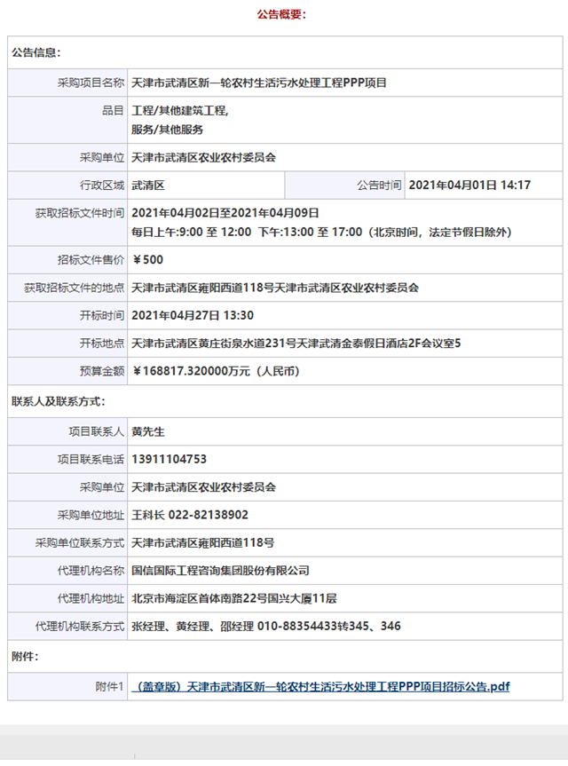 項(xiàng)目名稱:天津市武清區(qū)新一輪農(nóng)村生活污水處理工程PPP項(xiàng)目
