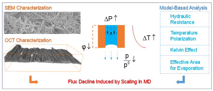 作為新型膜分離技術(shù)的代表之一,膜蒸餾在處理高濃度鹵水和苦咸水中具有獨(dú)特優(yōu)勢。然而,微溶無機(jī)鹽在膜蒸餾過程中結(jié)晶并形成結(jié)垢層是制約該技術(shù)發(fā)展的難題之一;尤其以硫酸鈣為代表的非堿性微溶鹽,目前仍缺乏有效的解決方法,其相關(guān)機(jī)理的研究對推動膜蒸餾技術(shù)的應(yīng)用具有重要意義。結(jié)垢的發(fā)生不但會造成通量的下降,還會對分離膜產(chǎn)生不可逆的損傷。由于表征技術(shù)的相對欠缺,膜蒸餾過程中結(jié)垢現(xiàn)象發(fā)生和演化的機(jī)理仍未被充分解析。