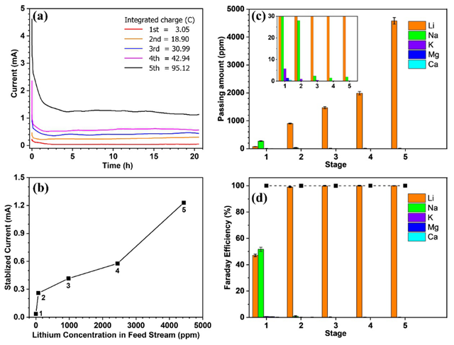 圖2.(a)提鋰過程中每一級的計時電流曲線,曲線與時間的積分即為該過程中遷移的總電荷量;(b)提鋰過程中穩(wěn)定電流與原料鋰濃度的關系;(c)提鋰過程中每一級的離子通過量;插圖顯示情節(jié)在低范圍內,以幫助查看干擾離子的結果:(d)提鋰過程中每一級中不同離子的遷移對電流的貢獻率。實心方塊表示總體效率(100%)。