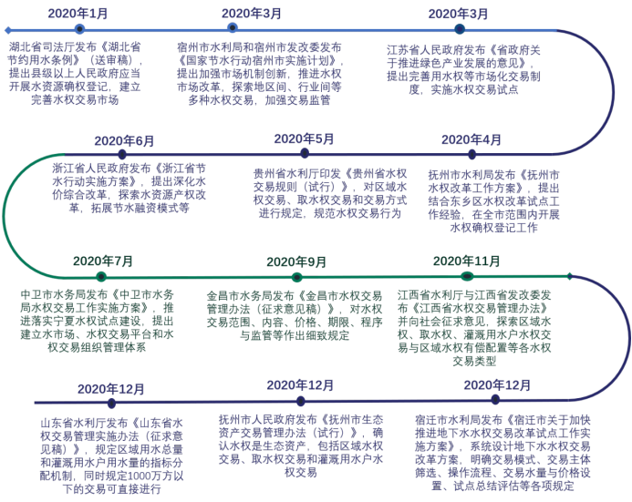 相比2019年,2020年全國(guó)地方級(jí)政策出臺(tái)進(jìn)度明顯加快,水權(quán)制度設(shè)計(jì)進(jìn)一步優(yōu)化。不僅有多個(gè)省著手進(jìn)行水權(quán)的確權(quán)登記工作,將區(qū)域水權(quán)、取水權(quán)和灌溉用水戶水權(quán)交易納入相關(guān)政策規(guī)定,也有部分省份進(jìn)行制度創(chuàng)新,如江西省將區(qū)域水權(quán)有償配置納入水權(quán)交易范疇,對(duì)部分水權(quán)進(jìn)行行政區(qū)域內(nèi)的有償分配,進(jìn)一步提高水資源價(jià)值;浙江省進(jìn)一步提出將探索水價(jià)綜合改革、拓展節(jié)水融資模式,拓寬水權(quán)價(jià)值實(shí)現(xiàn)范疇;宿遷市出臺(tái)水權(quán)改革方案,對(duì)地下水取水權(quán)交易的各項(xiàng)規(guī)定進(jìn)行明確規(guī)定,對(duì)水權(quán)交易納入新產(chǎn)品提供制度參考。