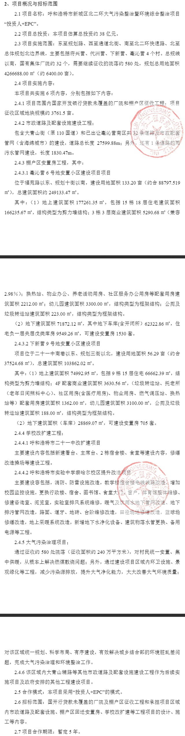 項目位于呼和浩特市新城區(qū),東至規(guī)劃路,西至通道北街,南至北二環(huán)快速路,北至總體規(guī)劃北邊界線,規(guī)劃總用地面積約4.3平方公里,擬采用 ABO+EPC 的運(yùn)作模式實(shí)施,主要合作內(nèi)容包括廠院和棚戶區(qū)征收工程、市政道路及配套設(shè)施建設(shè)工程、棚戶區(qū)安置房工程及學(xué)校改擴(kuò)建工程、大氣污染治理項目。