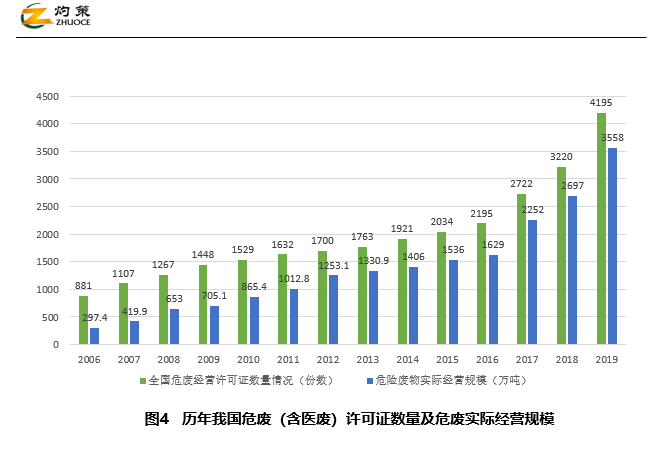 我國危廢處理行業(yè)的經(jīng)營規(guī)模在逐年增長,據(jù)《年報》,截至2019年底,全國危險廢物許可證持證單位共4195個,同比增長30.3%。其核準(zhǔn)收集和利用處置能力達(dá)到12896萬噸/年(含單獨收集能力1826萬噸/年);2019年度實際收集和利用處置量為3558萬噸(含單獨收集81萬噸)。與2006年相比,2019年危險廢物持證單位核準(zhǔn)收集和利用處置能力、危險廢物實際收集和利用處置量分別增長1709%和1098%。