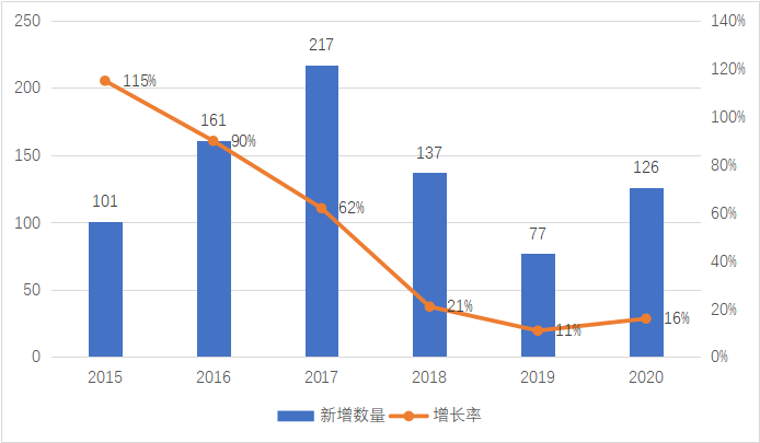 圖1 綠色基金新增數(shù)量及增長率(2015-2020年)