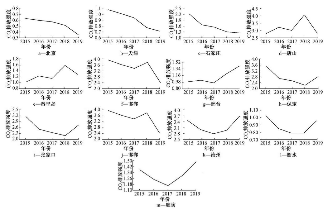 圖2為京津冀城市群CO2排放強(qiáng)度特征及變化趨勢??梢灾庇^地看出:中國CO2排放強(qiáng)度地區(qū)分布呈現(xiàn)顯著的非均衡特征,北京市的CO2排放強(qiáng)度最低,近5年碳排放強(qiáng)度為0.36~0.64 t/萬元GDP。其次是天津市和衡水市,其排放強(qiáng)度較小,但仍是北京市碳排放強(qiáng)度的1倍左右,為0.71~1.07 t/萬元GDP。廊坊、邢臺(tái)和秦皇島的CO2排放強(qiáng)度居中游水平,近5年碳排放強(qiáng)度為0.96~1.59 t/萬元GDP。唐山、保定、邯鄲、滄州和張家口的CO2排放較高,碳排放強(qiáng)度為2.19~4.07 t/萬元GDP,特別是2018年的唐山市,CO2排放強(qiáng)度最高,達(dá)到4.07 t/萬元GDP。