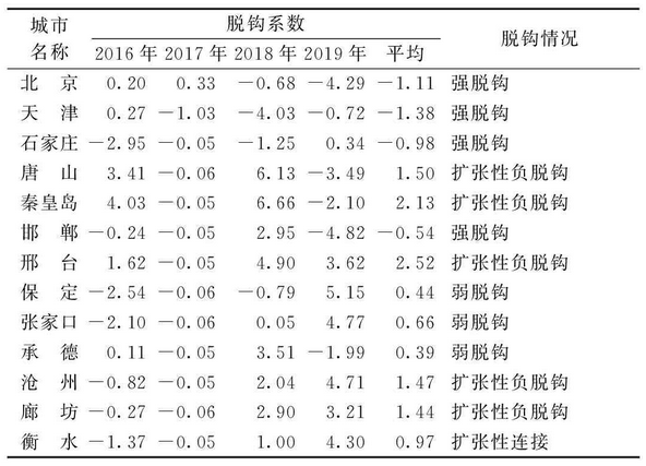 首先分別計(jì)算2015—2019年的脫鉤系數(shù),取這些年間脫鉤系數(shù)的平均值作為該城市的脫鉤情況,結(jié)果見表2。可知:北京、天津、石家莊和邯鄲經(jīng)濟(jì)增長與碳排放呈強(qiáng)脫鉤狀態(tài),表明這4個(gè)城市經(jīng)濟(jì)發(fā)展與碳排放量反向變動(dòng),即經(jīng)濟(jì)不斷增長,但碳排放量卻逐漸減少;保定、張家口和承德經(jīng)濟(jì)增長與碳排放呈弱脫鉤狀態(tài),表明該3個(gè)城市經(jīng)濟(jì)發(fā)展的增長速度大于碳排放的增長速度;唐山、秦皇島、邢臺(tái)、滄州和廊坊經(jīng)濟(jì)增長與碳排放呈現(xiàn)擴(kuò)張性負(fù)脫鉤狀態(tài),表明這5個(gè)城市的經(jīng)濟(jì)增長速度小于碳排放的增長速度;只有衡水市的經(jīng)濟(jì)增長與碳排放呈擴(kuò)張性連接狀態(tài),表明該城市經(jīng)濟(jì)增長速度同比正增長。表2 京津冀城市群經(jīng)濟(jì)增長與碳排放脫鉤結(jié)果
