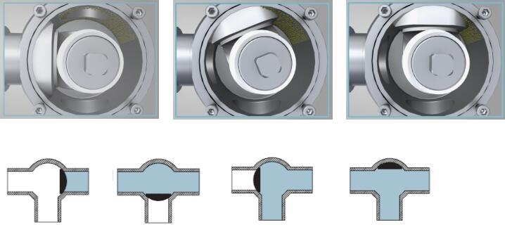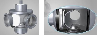 弧形閥可以實現流體的換向,相對于換向閥和三通球閥的優(yōu)點是易清洗,不會夾掛物料。