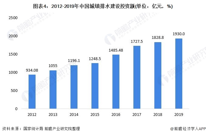 在《城市排水防澇設(shè)施建設(shè)中央預(yù)算內(nèi)投資專項(xiàng)管理暫行辦法》等排水投資政策的推動下,我國水務(wù)投資持續(xù)加碼,自2013年起我國城鎮(zhèn)排水建設(shè)投資額每年快速增長,2012尚且為934.08億元,到2017年就已達(dá)到1727.52億元,增長了近一倍,2019年投資額達(dá)1930.02億元。