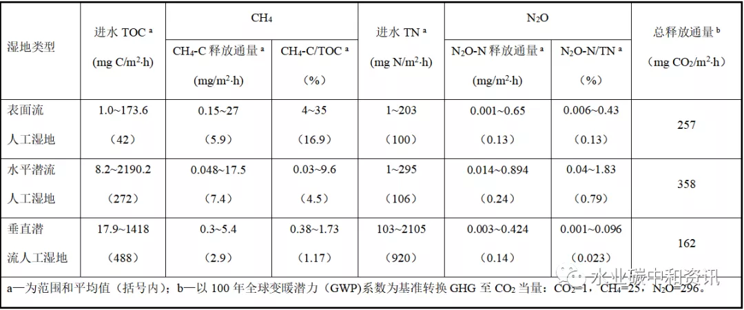將CH4和N2O折算成CO2當(dāng)量后得出的總釋放通量為:水平潛流(358 mg CO2/m2×h)>表面流(257mg CO2/m2×h)>垂直流(162 mg CO2/m2×h)。可見(jiàn),垂直流人工濕地的GHG釋放通量最小。其實(shí),垂直流濕地占地面積也最小,這更加凸顯了其GHG釋放總量明顯小于水平流和表面流濕地的特征。另外,表1還顯示,不同人工濕地中CH4都是主要GHG類型,對(duì)總釋放量貢獻(xiàn)率均>60%。因此,控制CH4釋放應(yīng)成為人工濕地減少GHG排放的關(guān)鍵。