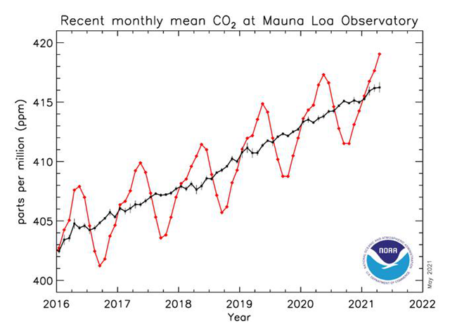 圖3:美國夏威夷Mauna Loa 天文臺二氧化碳濃度監(jiān)測數(shù)據(jù)(數(shù)據(jù)來源于Global Monitoring Laboratory)
