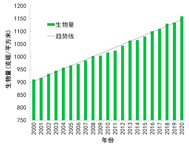 圖3所示為美國夏威夷Mauna Loa天文臺的監(jiān)測數(shù)據(jù),從中看出,近年來二氧化碳的濃度逐年是穩(wěn)步上升,但每月的數(shù)據(jù)卻隨著地表植物的固碳作用變化而起伏不定,由此我們可以得出一個結(jié)論,生物固碳是目前最有效的降碳方式。基于此,我國非常重視植被生物量增加。2000到2020年我國植被生物量呈增加趨勢,平均每年增加12克碳/平方米。植被生物量由2000年的909克碳/平方米增加到2020年的1159 克碳/平方米,植被固碳增長27.5%,如圖4所示。從空間分布看,生物量明顯增長的區(qū)域主要分布在我國中東部地區(qū),其中東北地區(qū)、西南地區(qū)、江南和華南大部森林生物量增加明顯,平均每年增加20-60 克碳/平方米。2000年以來全國植被生物量的持續(xù)增加表明,植被在抵消著人為碳排放、降低著大氣二氧化碳含量。所以我們?nèi)粘I钪卸喾N花花草草,不但美化環(huán)境,賞心悅目,而且還可以為碳中和做貢獻。