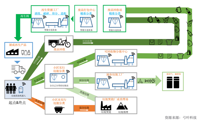 以弓葉科技為例,其將Ai和固廢大數(shù)據(jù)相結(jié)合,實(shí)現(xiàn)固體廢棄物的精準(zhǔn)分類。目前,越來越多的再生資源回收企業(yè)正在積極建設(shè)數(shù)字化、智能化、自動(dòng)化的可回收物分揀中心,通過引進(jìn)人工智能垃圾分揀機(jī)器人代替人工,提高可回收物精細(xì)化分選效率。例如,北京愛分類和弓葉科技合作建設(shè)的可回收垃圾智能分揀中心、上海城投和弓葉科技合作建設(shè)的可回收垃圾智能分揀中心,均在此列。