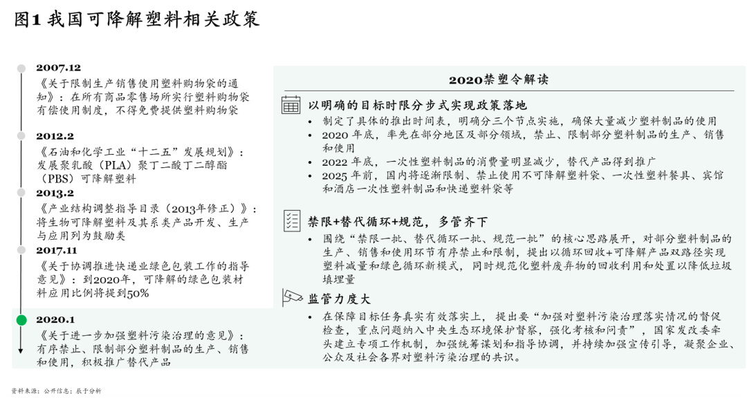 “白色污染是伴隨人類社會、經(jīng)濟發(fā)展過程中面臨的一個巨大挑戰(zhàn),21世紀(jì)以來,全球興起可降解風(fēng)潮,多個國家發(fā)布趨嚴(yán)政策推動行業(yè)發(fā)展。2020年1月,我國也正式從“限塑”轉(zhuǎn)為“禁塑”,繼而帶動可降解塑料行業(yè)從早期的低迷發(fā)展期進(jìn)入高速發(fā)展期。由于經(jīng)歷了長期的低迷發(fā)展,當(dāng)前行業(yè)競爭較為混亂且尚未定局,把握住核心要素便有可能成為龍頭企業(yè),領(lǐng)航黃金時代。 我國可降解塑料市場早在2012年就已經(jīng)起步,但由于早期市場需求低迷,原料成本過高、產(chǎn)能有限,行業(yè)整體發(fā)展緩慢,進(jìn)入市場較早的一些企業(yè)甚至因訂單長期不足而被迫轉(zhuǎn)型。直到2020年1月,《關(guān)于進(jìn)一步加強塑料污染治理的意見》(以下簡稱“禁塑令”)出臺,要求有序禁止、限制部分塑料制品的生產(chǎn)、銷售和使用,積極推廣替代產(chǎn)品,正式從“限塑”轉(zhuǎn)為“禁塑”(見圖1)。