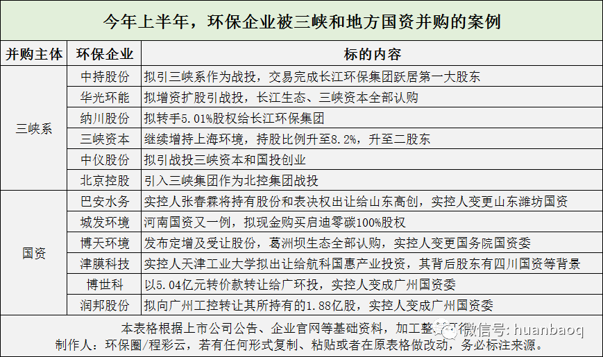 圖二:今年前6月環(huán)保行業(yè)收并購案例數(shù)交易資金排名前三的都是環(huán)保上市企業(yè)并購分別是:中國天楹欲115億元出售海外資金,通用首創(chuàng)50.84億元轉(zhuǎn)讓持有的40%深水集團股權(quán),以及云南水務(wù)欲以21億元將持有的浙江海云環(huán)保、首創(chuàng)水務(wù)等部分股權(quán)轉(zhuǎn)讓給錢江生化。(如圖三所示)圖三:今年上半年環(huán)保企業(yè)并購資金排行半年的交易量,就幾乎趕上2015年-2017年,每年全年400億元的交易額了,而且頭部龍頭企業(yè)兼并重組在今年上半年愈發(fā)猛烈。拋開5月14日世界級環(huán)保巨頭威立雅和蘇伊士的合并不說,經(jīng)過此輪殘酷的“你死我活”,我國環(huán)保產(chǎn)業(yè)已經(jīng)初步形成了以三峽、中節(jié)能等大央企和地方國資為首的“兩大幫派”的局面。稍加分類就會發(fā)現(xiàn),上半年39起并購案例,有12起,約1/3都跟三峽系和各省地方國資有關(guān),大抵也是這波“混改”潮的延續(xù)。(如圖四所示)其實,仔細推算,形成“大央企和地方國資為主,中小型技術(shù)裝備民企為輔”的局面,也只不過短短5-6年時間而已。回想起來,6年前,在素有“環(huán)保政策元年”之稱的2015年,也就是“十三五”的開局之年,環(huán)保行業(yè)才剛剛開始爆發(fā)。當(dāng)時正值環(huán)保利好政策大爆發(fā),“水十條”、“氣十條”、“土十條”、PPP等相關(guān)領(lǐng)域的政策接踵而至。各方勢力也是高舉高打,紛紛進入環(huán)保行業(yè),裹挾大批資金的中字頭央企、環(huán)保頭部企業(yè)以及中等規(guī)模上市民企都紛紛擼起袖子,加快搶灘國內(nèi)外環(huán)保市場。由三方勢力攪動“并購”潮,一路買買買,致使當(dāng)年環(huán)保并購案例高達136起,涉及400億元的交易金額。雖說400億元的交易資金相對于今年還不算很高,但是從并購主角、標的內(nèi)容以及并購目的來看,就已經(jīng)能夠明顯感覺到,我國環(huán)保產(chǎn)業(yè)開始發(fā)生翻天覆地的變化了。第一,從“買買買”到“賣賣賣”,背后折射競爭格局更迭。從并購的主角,買賣雙方來看,近兩年,不少明星環(huán)保上市民企,曾經(jīng)的市場“主角”,如今都淪為大央企、地方國資收割的對象,如啟迪環(huán)境、博天環(huán)境、巴安水務(wù)、津膜科技、博世科等。曾幾何時,這些環(huán)保企業(yè)也是并購的主角,輝煌時斥巨資買下諸多中小企業(yè),甚至喊出百億千億市值的目標,上演“蛇吞象”;但最終還是時運不濟,資金短缺,債務(wù)高企,現(xiàn)金流告急,不得不將曾經(jīng)并購的資產(chǎn)統(tǒng)統(tǒng)甩賣,祈求活下去。一是發(fā)生在2015年的清華控股、啟迪科服戰(zhàn)略并購桑德環(huán)境案,70億元的并購資金也直接刷新了當(dāng)時的行業(yè)記錄,被稱為改革開放以來中國環(huán)境領(lǐng)域最大的一筆并購。之后幾年,這樁并購案也是幾經(jīng)波折,先是2019年啟迪與桑德“分家”,文一波辭去啟迪桑德董事長職務(wù),完成“去桑德化”;然后發(fā)展越來越慢的啟迪環(huán)境項目幾度停工,陷入債務(wù)危機,不得不拋售相關(guān)資產(chǎn)緩解危機;在與雄安集團、三峽、合肥建投“談崩”后,最終在6月3日,與河南國資城發(fā)環(huán)境結(jié)成聯(lián)姻。二是買來海外資產(chǎn)Urbaser僅3年,近期又想高價賣出的中國天楹。按照中國天楹的說法,轉(zhuǎn)讓Urbaser控制權(quán),主要是扭轉(zhuǎn)公司現(xiàn)金流不足,降低資產(chǎn)負債率以及商譽減持的需要。看樣子,對于中國天楹這條“地方蛇”,要想吞并Urbaser這頭“國際大象”還是有點費勁的,胃口大了,容易消化不良。從“買買買”到“賣賣賣”,表面上看是一場商業(yè)游戲,背后折射的則是市場競爭格局的變化更迭,環(huán)保行業(yè)競爭日漸激烈的趨勢,以及細分領(lǐng)域增量產(chǎn)業(yè)的萎縮。比如中持在引入長江環(huán)保集團作為戰(zhàn)投時,就曾談到行業(yè)大背景變幻帶來的隱憂。“面對城市業(yè)務(wù)增量的萎縮以及市場競爭加劇,都會公司水務(wù)業(yè)務(wù)造成一定的影響,而且公司在城鎮(zhèn)污水處理、工業(yè)園區(qū)和工業(yè)污水處理等每個細分領(lǐng)域,競爭都很激烈,為了進一步提升實力,開拓新的利潤增長點,混改是戰(zhàn)略考量?!敝谐直硎?。第二,從奪權(quán)到無實控人,“混改”模式日漸科學(xué)?對于這波大央企、地方國資拋來的“橄欖枝”,不少環(huán)保企業(yè)又愛又怕。一方面,他們既對國資進入表示羨慕,希望借助其資金、政府關(guān)系、渠道、品牌壯大自己;另一方面,又流露出對“混改”后引入國企管理制度的憂慮,怕“被管死”。市場上也的確存在不少民營企業(yè)被國資并購后,由于實控人發(fā)生變更,使得原有人員不適應(yīng)新的國企管理體制,從而喪失市場活力的案例。