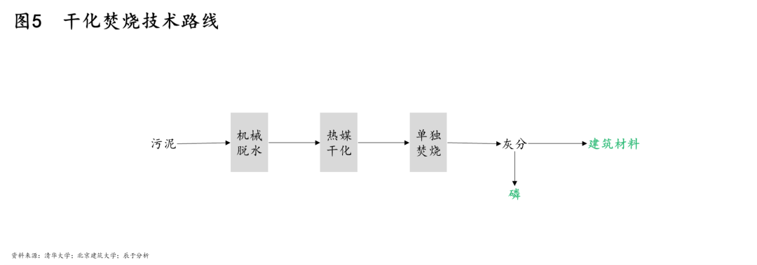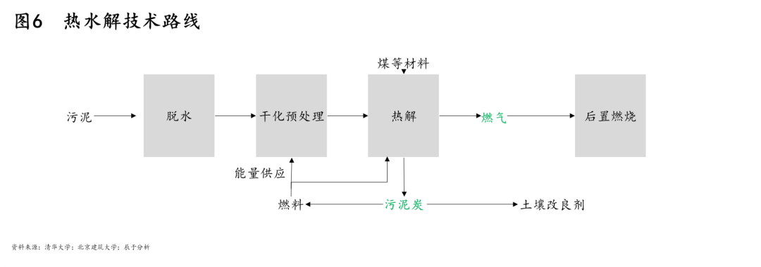 而在資源回收上,相比好氧堆肥,干化焚燒及熱水解則是更好的資源化方式,值得重點關(guān)注。干化焚燒的技術(shù)路線如圖5所示,作為最快捷、最徹底實現(xiàn)污泥減量化、穩(wěn)定化、無害化的最終處置技術(shù),干化焚燒后的資源化利用產(chǎn)品也更易走通;熱水解的技術(shù)路線如圖6所示,其生產(chǎn)過程清潔化,生成的污泥炭資源多樣化。