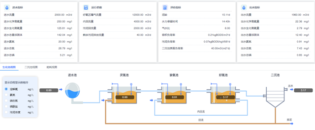 2) 評(píng)估不同運(yùn)行工況對(duì)水質(zhì),能耗的影響,實(shí)現(xiàn)工藝優(yōu)化和輔助方案決策;