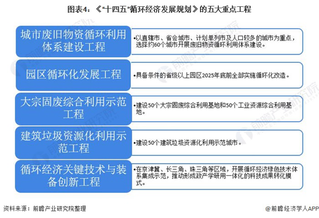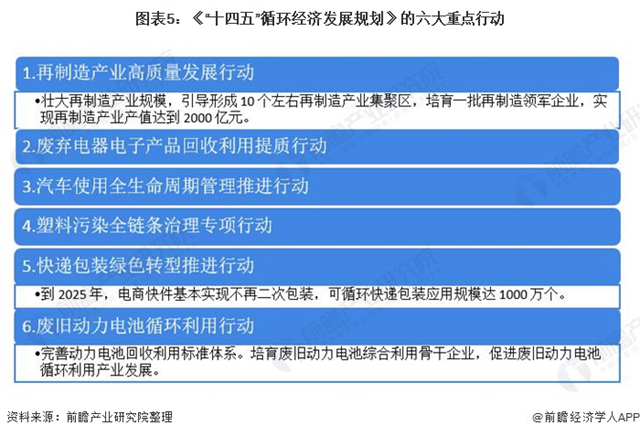《規(guī)劃》還提出了重點(diǎn)工程與行動,共有五大重點(diǎn)工程和六大重點(diǎn)行動。五大重點(diǎn)工程分別為城市廢舊物資循環(huán)利用體系建設(shè)工程、園區(qū)循環(huán)化發(fā)展工程、大宗固廢綜合利用示范工程、建筑垃圾資源化利用示范工程和循環(huán)經(jīng)濟(jì)關(guān)鍵技術(shù)與裝備創(chuàng)新工程。